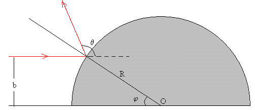 Se denomina parámetro de impacto b, a la distancia entre la dirección de la velocidad del centro del disco y el obstáculo puntual. Si el parámetro de impacto b, es mayor o igual que el radio del disco R, no se dispersa continuando con la dirección incidente original. Ahora bien, si el parámetro de impacto es menor que el radio del disco, suponiendo un choque elástico con un obstáculo fijo, el disco se refleja siguiendo una dirección que forma un ángulo suplementario a la suma del ángulo de incidencia i y reflejado r. Del mismo modo que en una reflexión especular, el ángulo de incidencia es igual al ángulo de reflexión, i=r. La normal en este caso es la recta que une el obstáculo puntual y el centro del disco. El ángulo de dispersión, como puede fácilmente deducirse de la figura, es
