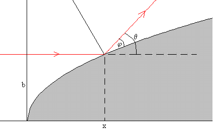 donde c es una constante Supondremos el choque entre la partícula y el obstáculo es perfectamente elástico. El movimiento de las partículas es paralelo al eje X. Como vemos en la figura, la relación entre el parámetro de impacto b=y y el ángulo de dispersión θ es