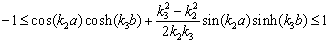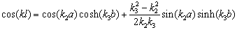 Tenemos un sistema homogéneo de cuatro ecuaciones con cuatro incógnitas, el determinante de los coeficientes debe ser cero. Para el caso en el que E<E0, que es el que estudiamos en el applet, k1 es una cantidad imaginaria, llamemos k1=ik3. Ecuación que nos da la relación entre la energía E y el número de onda k, y que representaremos en la ventana del applet. Ya que el módulo del coseno no puede ser mayor que la unidad, obtenemos así la condición impuesta a k3 y a k2 y por tanto a la energía E. Esta condición define las bandas de energía permitidas.