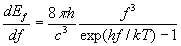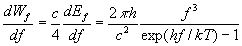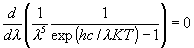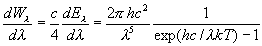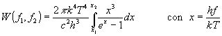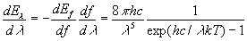 La segunda hipótesis de Planck, establece que la energía de los osciladores está cuantizada. La energía de un oscilador de frecuencia f sólo puede tener ciertos valores que son 0, hf , 2hf ,3hf ....nhf . La distribución espectral de radiación es continua y tiene un máximo dependiente de la temperatura. La distribución espectral se puede expresar en términos de la longitud de onda o de la frecuencia de la radiación. dEf /df es la densidad de energía por unidad de frecuencia para la frecuencia f de la radiación contenida en una cavidad a la temperatura absoluta T. Su unidad es (J·m-3)·s. donde k es la constante de Boltzmann cuyo valor es k=1.3805·10-23 J/K. dEl /dl es la densidad de energía por unidad de longitud de onda para la longitud de onda l de la radiación contenida en una cavidad a la temperatura absoluta T. Su unidad es (J·m-3)·m-1.