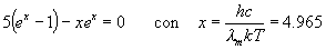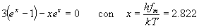 La ley del desplazamiento de WienLa posición del máximo en el espectro de la radiación del cuerpo negro depende de la temperatura del cuerpo negro y está dado por la ley de desplazamiento de Wien. Calculando la derivada primera de la función de la distribución de Planck expresada en términos de la longitud de onda o de la frecuencia Obtenemos la ecuación trascendente Este resultado constituye la ley de desplazamiento de Wien, que establece que el máximo de la densidad de energía dEl /dl por unidad de longitud de onda a distintas temperaturas T1, T2, T3, .., se produce a las longitudes de onda l1, l2, l3...tales que De modo similar en el dominio de las frecuencias Obtenemos la ecuación trascendente A medida que la temperatura T se incrementa el máximo se desplaza hacia longitudes de onda menores (mayores frecuencias). Como podemos comprobar el producto no nos da la velocidad de la luz c como se podría esperar a primera vista, ya que estamos tratando con el máximo de una distribución que nos da la intensidad por unidad de longitud de onda o por unidad de frecuencia. La luminosidad de un cuerpo caliente no se puede explicar, como se indica en algunos textos, a partir de la ley del desplazamiento de Wien, sino a partir de la intensidad de la radiación emitida en la región visible del espectro, tal como veremos más abajo. Así, a temperaturas tan elevadas como 6000 K el máximo medido en el eje de frecuencias de la distribución espectral se sitúa en la región del infrarrojo cercano. Sin embargo, a esta temperatura una proporción importante de la intensidad emitida se sitúa en la región visible del espectro.