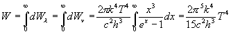 La intensidad total en W·m-2, de la radiación emitida por un cuerpo negro, se obtiene integrando la expresión anterior para todas las longitudes de onda (o frecuencias). o bien W=s ·T4, con s =5.670·10-8 (Wm-2K-4) Esta expresión se conoce como ley de Stefan-Boltzmann. La energía emitida por un cuerpo negro por unidad de área y unidad de tiempo es proporcional a la cuarta potencia de la temperatura absoluta T. Del mismo modo, integrando dEf/df para todas las frecuencias, podemos comprobar que la densidad de energía de la radiación contenida en una cavidad es proporcional a la cuarta potencia de la temperatura absoluta T de sus paredes. La constante de proporcionalidad vale s=4s /c.