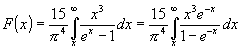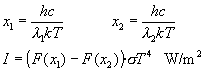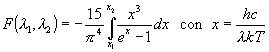 Intensidad de la radiación emitida en una región del espectroVamos a calcular, la intensidad emitida por un cuerpo negro en una región del espectro comprendida entre las frecuencias f1 y f2, o entre las longitudes de onda l1=c/f1 y l2=c/f2 La fracción de la intensidad emitida en una región del espectro es el cociente entre la intensidad emitida en dicha región dividido por la intensidad total (ley de Stefan). Esta fracción no depende de l o de T sino del producto l T. Esto quiere decir que por ejemplo la fracción de la intensidad emitida por un cuerpo negro en la región del espectro comprendida entre 0 y 10 mm a 1000º K es la misma que la fracción de la intensidad emitida en la región comprendida entre 0 y 5 mm a 2000º K. Para calcular la integral definida se ha de emplear un procedimiento numérico, por ejemplo el método de Simpson, o bien la aproximación que se explica a continuación. Se define la función F(x) a El término 1-e-x en el denominador se puede expresar como suma de potencias de e-x desarrollando el binomio (1-z)-1=1+z+z2+z3+z4+ Integrando por partes obtenemos la siguiente expresión para F(x) Un pequeño programa de ordenador, nos permite calcular el valor de F(x1) y de F(x2) y a partir de la diferencia el valor de fracción de la intensidad emitida por el cuerpo negro en una región dada del espectro comprendida entre dos longitudes de onda o entre dos frecuencias. La intensidad total emitida en la región del espectro delimitada por las longitudes de onda l1 y l2 se obtiene donde s ·T4 como se ha explicado, es la intensidad de la radiación emitida en todas las regiones del especto. En la siguiente tabla, se proporcionan los datos acerca del tanto por ciento de la contribución de la radiación infrarroja, visible y ultravioleta a la radiación de un cuerpo negro a las temperaturas que se indican.