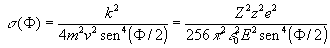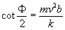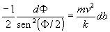 DescripciónComo hemos visto al estudiar el fenómeno de la dispersión, la interacción entre partículas cargadas positivamente corresponde a una fuerza central y conservativa. La energía total es siempre positiva por lo que la trayectoria es siempre una hipérbola. Se denomina parámetro de impacto a la distancia existente entre la dirección de la partícula incidente y el centro de fuerzas. Una vez que la partícula ha sido dispersada por el núcleo se aleja del centro de fuerzas siguiendo una trayectoria que tiende asintóticamente a una línea recta. El ángulo F que forma dicha recta con el eje horizontal se denomina ángulo de dispersión. La fórmula que relaciona el parámetro de impacto b con el ángulo de dispersión F para una energía E dada de la partícula alfa, como hemos visto, es la siguiente.