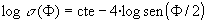 Se activa el botón de radio Resultados y se pulsa el botón titulado Calcula, el programa muestra el número de partículas dispersadas en distintos intervalos angulares. Se activa el botón de radio titulado Gráfica y a continuación, se pulsa el botón titulado Calcula. Comprobamos la fórmula de Rutherford de la siguiente manera: Tomando logaritmos en la fórmula de Rutherford donde s (F )= N/(2p·senF), N es el número de partículas registradas en el detector de ángulo F. En el eje vertical, se representa el logaritmo de s (F ). En el eje horizontal se representa el logaritmo del seno de la mitad del ángulo de dispersión sen(F /2). Se obtiene una línea recta cuya pendiente es 4 o un número muy próximo a éste. Verificándose de este modo, la famosa fórmula de Rutherford.