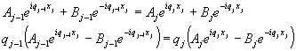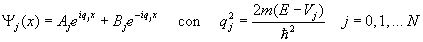 Sistema de pozos de potencialLa cuantización de la energía es el concepto más importante en Mecánica Cuántica, ya que explica las propiedades de los átomos que constituyen los componentes básicos de la materia. Para calcular los niveles de energía, es necesario resolver una ecuación diferencial de segundo orden, la ecuación de Schrödinger, para la función potencial especificada, que en muchos casos carece de solución analítica sencilla. En la sección dedicada a la cuantización de la energía ya se estudiaron dos sistemas simples: la caja de potencial y el pozo de potencal. La solución de la ecuación de Schrödinger en un potencial simétrico da lugar a funciones de onda simétricas y antisimétricas. El estado fundamental está descrito por una función de onda simétrica y a continuación, le sigue un estado descrito por una función de onda antisimétrica y así sucesivamente, de forma alternada. Consideremos un sistema de pozos de potencial iguales separados por barreras de potencial de la misma anchura y altura. Resolviendo la ecuación de Schrödinger en cada una de las regiones tenemos. donde qj es un número complejo real o imaginario dependiendo si la región es un pozo Vj=0 o una barrera E<Vj. En las fronteras entre las regiones hemos de aplicar las condiciones de continuidad de la función de onda y de su derivada primera. Sea la frontera entre las regiones j-1 y j, cuya abscisa es xj. que relaciona coeficientes Aj y Bj con Aj-1 y Bj-1 Tenemos un sistema de 2N ecuaciones con 2N+2 incógnitas. Ahora bien, el número de incógnitas se reduce teniendo en cuenta la simetría de la función potencial, y la definición de función de onda: En la región N, la función de onda YN(x) tiende a cero al hacerse x grande, de modo que al ser qN imaginario, el coeficiente BN debe de ser cero. En la primera región de potencial la función de onda es