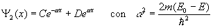 La función de onda Y1(x) contiene las partículas incidentes y reflejadas, Y2(x) decrece exponencialmente, la exponencial positiva no está excluida ya que la región clásicamente prohibida no es indefinida como en el caso del escalón de potencial. Debido a que Y2(x) no ha alcanzado el valor cero en x=a, la función de onda continúa a la derecha de dicho punto, con amplitud A'. La función de onda Y3(x) representa las partículas transmitidas. Desde el punto de vista de la Mecánica Cuántica, es posible que una partícula atraviese la barrera de potencial aún cuando su energía cinética sea menor que la altura de la barrera. Aplicando las condiciones de continuidad de la función de onda y de su derivada primera en los puntos x=0, y x=a, obtenemos las siguientes ecuaciones que relacionan los coeficientes B, C, D, y A' en función de A. Se obtiene se obtiene Se denomina coeficiente de transmisión a la proporción de partículas incidentes que son transmitidas El coeficiente de transmisión disminuye rápidamente a medida que se incrementa la anchura de la barrera de potencial.