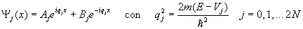 Las ecuaciones de continuidad de la función de onda y de su derivada primera en x=a, relacionan C y D con A', y en x=0, relacionan A y B con C y D, y por tanto, con A' Finalmente, obtenemos la siguiente expresión para el coeficiente de transmisión Como podemos apreciar T toma el valor máximo 1, cuando k'a=np, siendo n un número entero. Como k' es el número de onda, k'=2p /l', se obtiene que que relaciona la longitud de onda l' de la partícula en la barrera de potencial con la anchura a de la misma, para que se obtenga el máximo en el coeficiente de transmisión. Los valores de la energía E, o mejor del cociente E/E0 ,para los cuales hay un máximo del coeficiente de transmisión se denominan resonancias. N barreras de potencial Estudiaremos ahora el caso en el que hay N barreras de potencial de la misma anchura a y separadas unas de otras la misma cantidad b tal como se aprecia en la figura. Observaremos que se producen picos de resonancia adicionales, dando lugar a un comportamiento complejo del coeficiente de transmisión. Resolvemos la ecuación de Schrödinger para cada una de las distintas regiones Donde qj es un número complejo real o imaginario dependiendo de que E>Vj o E<Vj. En las fronteras entre las regiones, aplicamos las condiciones de continuidad. Sea la frontera entre las regiones j-1 y j, cuya abscisa es xj. que relaciona los coeficientes Aj y Bj con Aj-1 y Bj-1 Teniendo en cuenta que solamente hay partículas trasmitidas en la región 2N, resulta que B2N=0. Obtenemos los valores de todos los coeficientes Aj y Bj en términos de A2N que actúa como factor de escala. El coeficiente de transmisión se define como la proporción de partículas incidentes que se trasmiten y se obtiene mediante el cociente.