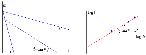 Si representamos logf en el eje vertical y logA en el eje horizontal obtenemos una línea recta cuya pendiente es 5/4 tal como se muestra en la parte derecha de la figura.