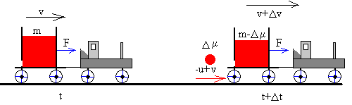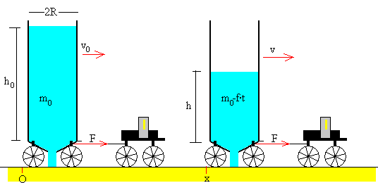 El momento lineal del sistema en este instante es p(t+Δt)=(m-Δμ)(v+Δv)+ Δμ(–u+ v) La variación del momento lineal entre el instante t y el instante t+Δt es Δp= p(t+Δt)- p(t)=m·Δv- u·Δμ-Δv·Δμ En el límite cuando Δt→0 La masa M del sistema formado por el depósito m y la arena descargada μ es constante M=μ+m, por lo que dμ+dm=0. La masa del depósito disminuye en dm y aumenta la masa de la arena descargada en la misma cantidad. Si la velocidad u de salida de la arena respecto del depósito es cero, la ecuación del movimiento se escribe que es similar a la expresión para el caso de una masa constante, pero con la importante diferencia de que la masa es variable con el tiempo. También, es similar a la ecuación del movimiento de un cohete de empuje constante, donde F=u·D es la fuerza de empuje que proporcionan los gases al quemarse. Supondremos que el depósito se mueve con velocidad inicial v0, en el instante inicial t=0, en el que se abre el orificio de salida de la arena.