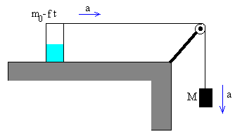Movimiento de un depósito de arena bajo la acción de una fuerza variable.En este apartado, se estudia un sistema en el que la masa y la fuerza aplicada cambian. Consiste en un depósito de arena que pierde masa por su parte inferior, y que se desplaza sobre dos vías paralelas, que ejercen una fuerza de rozamiento cuando el depósito se desplaza. Este depósito está unido mediante una cuerda que pasa por una polea a un cuerpo cuya masa M es constante, tal como se muestra en la figura