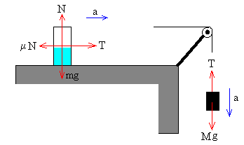 La ecuación del movimiento del depósito es T-μN=ma La ecuación del movimiento del cuerpo que cuelga es Mg-T=Ma Primer etapa. La masa del depósito disminuye La masa del depósito varía con el tiempo de la forma m=m0-f·t Siendo m0 la masa inicial (depósito vacío más la arena que contiene), y f el flujo constante de arena que sale por el orificio situado en su parte inferior. Eliminando T del sistema de ecuaciones