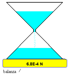 La posición Yc del centro de masas del sistema está dada por donde M es la masa total del reloj de arena, y C es una constante que tiene en cuenta la arena que está cayendo, la masa del recipiente de vidrio y otros detalles fijos de la construcción del reloj de arena. Derivando con respecto del tiempo, obtenemos la velocidad del centro de masas vc El flujo f se define como la masa que sale del recipiente superior en la unidad de tiempo, o que entra en el recipiente inferior en la unidad de tiempo. La velocidad del c.m. vc tiene una expresión muy simple Mvc=f(y1-y2) Como y1<y2, la velocidad del c.m vc es negativa (hacia abajo) Derivando de nuevo, con respecto del tiempo, obtenemos la aceleración del centro de masas El flujo f de arena es aproximadamente constante, por lo que el segundo término es casi nulo. Colocamos el reloj de arena sobre una balanza electrónica. Sea ΔF, la diferencia entre el peso N del reloj en marcha y el peso Mg del reloj de arena parado.