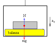 La diferencia es ΔF=N-Mg=Mac La balanza mide esta diferencia. Al principio cuando el reloj está parado ΔF=0, pero luego, se incrementa hasta que tiende (teóricamente) a infinito cuando deja de fluir la arena procedente del recipiente cónico superior. Vemos como el c.m. del sistema, señalado por un punto de color rojo, desciende a medida que cae la arena del recipiente cónico superior.