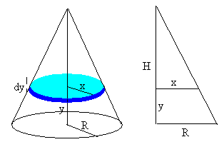 La posición yc centro de masa de una figura cónica de revolución alrededor del eje Y se calcula mediante la fórmula Para integrar se ha de relacionar x e y La integral es inmediata El denominador es el volumen del tronco de altura h. Cuando h=H tenemos el centro de masas de un cono macizo de radio R y altura H El denominador de yc es el volumen del cono πR2H/3 Calculamos la posición del centro de masas de cada unas de las dos porciones de arena: un tronco de cono y de un cono invertido, respecto del origen situado en el vértice común de ambos conos.