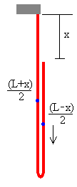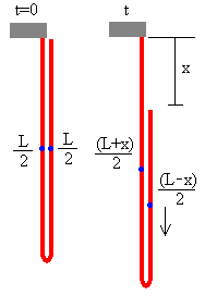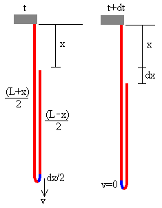 En el instante t, el extremo libre ha descendido una altura x. La cadena se encuentra doblada, pero la longitud de cada una de las porciones es distinta. La porción izquierda, tiene una longitud (L+x)/2 y la porción derecha (L-x)/2. La porción izquierda de la cadena se encuentra en reposo. La porción derecha se mueve con velocidad dx/dt. La energía de la cadena en el instante t es