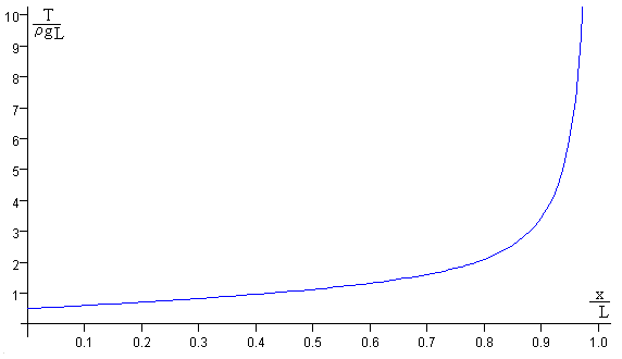 Aplicando el principio de conservación de la energía, obtuvimos la velocidad dx/dt de caída En la figura, se representa T0/(ρgL) en función de x/L. Cuando x→L, T0→∞,
