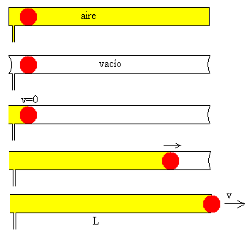 Se pulsa el botón titulado Empieza Primero, se conecta el tubo a una bomba de vacío, y un manómetro nos señala la disminución de la presión en el tubo sellado por ambos extremos. A continuación, se observa el movimiento del proyectil (en color rojo) a lo largo del tubo, y la columna de aire (en color amarillo) detrás. En la parte superior del applet, se representa, la velocidad v del proyectil en función de la posición x, medida desde la parte izquierda del tubo que se toma como origen. El proyectil alcanza una velocidad máxima al final del tubo y luego, disminuye debido al rozamiento con el aire. En esta “experiencia” anotaremos la velocidad final v0 y la relacionaremos con la masa m del proyectil y con la longitud L del tubo. |