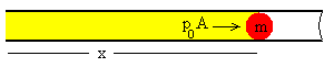 Movimiento del proyectil en el tubo de lanzamientoSupongamos que el proyectil tiene sección A y masa m. La fuerza que ejerce la presión atmosférica p0 sobre el proyectil es p0·A. Pero esta fuerza ha de acelerar el proyectil de masa m y la columna de aire de masa ρAx por detrás del proyectil (en color amarillo en la figura).