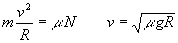 El vehículo comienza a deslizar en la dirección radial, cuando lleva una velocidad tal que Fr=μN. En el sistema de dos ecuaciones N(cosθ-μsenθ)=mg despejamos la velocidad máxima v que puede llevar el vehículo para que describa la curva con seguridad