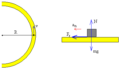 Curva sin peralteUn automóvil describe una trayectoria circular de radio R con velocidad constante v. Una de las principales dificultades que se presenta a la hora de resolver este problema es la de separar el movimiento tangencial (uniforme con velocidad constante) del movimiento radial del vehículo que es el que trataremos de estudiar. Fundamentos físicosSuponemos que el vehículo describe una trayectoria circular de radio R con velocidad constante v. Para un observador inercial, situado fuera del vehículo, las fuerzas que actúan sobre el móvil son: