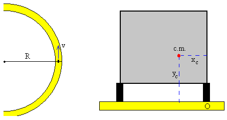 La estabilidad de un vehículoConsideremos un vehículo que está describiendo una curva de radio R, con velocidad constante v. Debido a la distribución de la carga, el centro de masas está situado en la posición xc, yc tal como se señala en la figura. Si el coeficiente de rozamiento entre las ruedas del vehículo y la carretera es μ. Vamos a determinar si