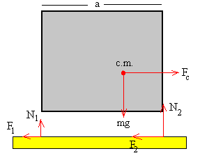 Si el vehículo permanece en reposo a lo largo de la dirección radial, tendremos que N1+N2=mg Tomando momentos respecto de O. La condición de equilibrio se expresa -N1·a-Fc·yc+mg·xc=0 Siendo a la distancia entre las ruedas. Despejamos N1 en esta última ecuación