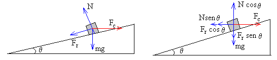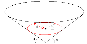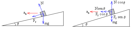 En la figura de la izquierda, se muestran las fuerzas y en la figura de la derecha, se ha sustituido la fuerza de rozamiento Fr y la reacción del plano N por la acción simultánea de sus componentes rectangulares. Una de las dificultades que tienen los estudiantes es la de situar correctamente la aceleración normal, an que suelen ponerla paralela al plano inclinado, en vez de horizontal. Entonces se les muestra que la circunferencia que describe el vehículo es una sección cónica cortada por un plano perpendicular al eje del cono y por tanto, el centro de dicha circunferencia está situada en dicho plano y no en el vértice del cono.