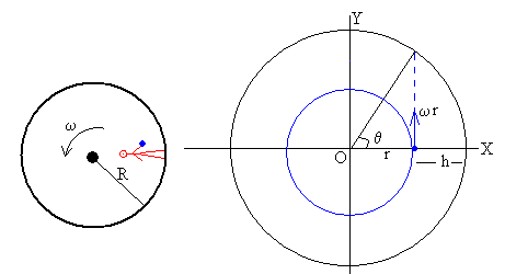El astronauta se representa por un segmento de color azul que está en reposo sobre la nave, por tanto, gira con la misma velocidad angular ω. Se pulsa el botón titulado Empieza El cuerpo se deja “caer” desde la altura h, describiendo un movimiento rectilíneo uniforme hasta que choca con el “suelo”. |