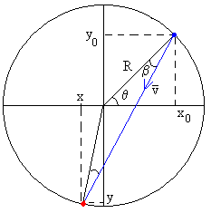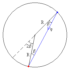 La trayectoria es la cuerda que une el punto de lanzamiento (x0, y0) y el punto (x, y) de impacto en el “suelo” de la nave espacial. El punto de lanzamiento, el centro de la circunferencia y el punto de impacto, forman un triángulo isósceles. La distancia entre el punto de lanzamiento y de impacto es 2Rcosβ, y el tiempo t de vuelo es