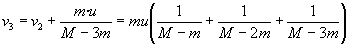 En el instante 2Dt, el cohete expulsa otra fracción m de combustible con velocidad u respecto del cohete o v2-u respecto de Tierra. El cohete pierde otra masa m y adquiere una velocidad v3. Aplicando el principio de conservación del momento lineal, despejamos v3.