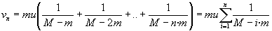 En el instante (n-1)Dt, el cohete expulsa la última fracción m de combustible con velocidad u respecto del cohete o vn-1-u respecto de Tierra. El cohete pierde otra masa m y adquiere una velocidad vn. El cohete se moverá con velocidad constante vn en a partir del instante t=(n-1)D t. La última fracción m del combustible expulsado se moverá con velocidad constante vn-1-u.