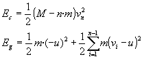 EnergíaLa energía final del sistema, es la suma de la energía cinética del cohete Ec con velocidad final vn, y la energía cinética Eg de las fracciones de masa m de combustible expulsados con velocidad (-u), (v1-u), (v2-u) (vn-1-u), respectivamente.