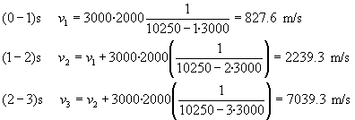 La masa inicial del cohete es (carga útil+combustible+masa del depósito) M=800+1.05·9000=10250 kg. La masa de cada fracción de combustible es m=9000/3=3000 kg, y se expulsan en los instantes t=0, t=1, y t=2 s. La velocidad con la que se expulsa cada una de las fracciones es u=2000 m/s constante respecto del cohete, y está fijada en el programa interactivo. Modelo discretoLas velocidades del cohete en los intervalos de tiempo que se indican son