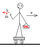 En el instante inicial t=0, expulsa una fracción m de combustible con una velocidad u respecto del cohete. El cohete pierde una masa m y adquiere una velocidad v1. Si el cohete estaba inicialmente en reposo, su momento lineal es cero. Por tanto, la suma del momento lineal del cohete más el momento lineal del combustible expulsado debe dar cero.