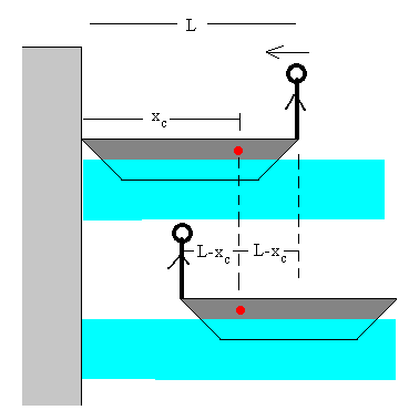 Cuando el barquero se mueve hacia la proa, el c.m. del sistema no modifica su posición, ya que se trata de un sistema aislado, cuyo c.m. estaba inicialmente en reposo Si nos fijamos en la figura inferior, podemos determinar fácilmente lo que se ha desplazado el hombre 2·(L-xc) y lo que se ha desplazado el barco respecto del muelle 2·xc-L.