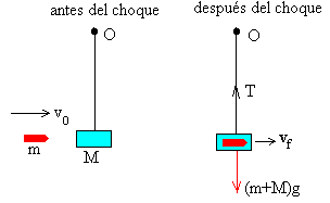 Choque inelástico instantáneoSi el choque es instantáneo, el bloque no se habrá desplazado de su posición vertical inicial, las fuerzas exteriores: el peso (m+M)g y la tensión de la cuerda T se anulan. El sistema es aislado y se puede aplicar el principio de conservación del momento lineal en el momento del choque. En el momento del choqueSea M la masa del bloque inicialmente en reposo y m la masa de la bala, cuya velocidad inmediatamente antes del choque es v0. La velocidad final vf del conjunto bala-bloque inmediatamente después del choque es mv0=(m+M)vf A continuación, se efectúa el balance energético de la colisión. La variación de energía cinética es