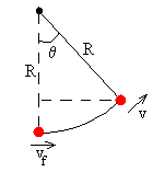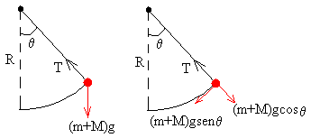 Movimiento después del choqueUna vez que el conjunto bala-bloque ha adquirido la velocidad vf, se desvía de la posición de equilibrio, haciendo un ángulo θ, al cabo de un cierto tiempo t tal como se indica en la figura. Supondremos que el bloque y la bala son masas puntuales. Descomponemos las fuerzas que actúan sobre sistema a lo largo de la dirección radial y a lo largo de la dirección tangencial