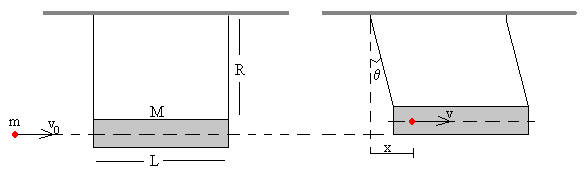 Choque inelástico de duración finitaVamos a considerar el sistema formado por una bala de masa m y un bloque de masa M, de forma rectangular de longitud L sujeto por sus extremos mediante dos varillas rígidas de masa despreciable tal como se muestra en la figura. La bala se dispara horizontalmente con velocidad v0 contra una de las caras del bloque a lo largo de la línea que pasa por su centro de masas (c.m.), penetra en el bloque una cierta distancia hasta que ambos adquieren la misma velocidad. A medida que la bala va penetrando en el bloque, el c.m. del bloque describe un movimiento circular de radio R. Las fuerzas que actúan sobre este sistema formado por la bala y el bloque son internas (en color azul) y externas (en color rojo) que dibujamos sobre cada uno de los cuerpos.