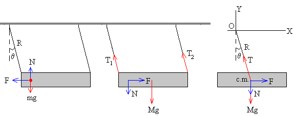 Dado el valor de la fuerza interna F, resolvemos esta ecuación diferencial por procedimientos numéricos con las siguientes condiciones iniciales t=0, θ=0, dθ/dt=0. Final del choqueSe finaliza el choque, en el instante tc tal que la componente a lo largo del eje X de la velocidad del c.m. Vx=Vc·cosθc coincide con la componente X de la velocidad de la bala vx=v0-F·tc/m Vc·cosθc=v0-F·tc/m Donde θc es el desplazamiento angular del c.m. del bloque en el instante tc y Vc la velocidad del c.m. del bloque en dicho instante. Ya hemos mencionado que las componentes Y coinciden en todo momento Vy=vy. Movimiento después del choqueUna vez que ha finalizado el choque, el bloque y la bala se mueven como un solo cuerpo de masa (m+M) bajo la acción de su peso y de la tensión de las cuerdas. El c.m. del sistema se mueve de acuerdo con la ecuación diferencial deducida en el primer apartado.