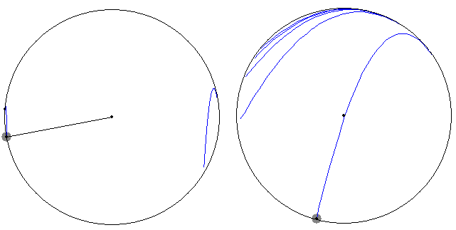 Para analizar este movimiento complejo, situamos el origen en el centro de la trayectoria circular y medimos los ángulos desde el eje X. El nivel cero de energía potencial lo situamos en el eje X. En la posición angular θ1 la partícula deja de describir la trayectoria circular, la tensión T de la cuerda es nula. En este momento, la ecuación de la dinámica del movimiento circular y el principio de conservación de la energía se escriben Combinando ambas ecuaciones determinamos el valor del ángulo θ1 Una vez que llega P1 describe un movimiento parabólico, la velocidad y la posición de la partícula es En el punto P2 la distancia entre la partícula y el centro vuelve a ser R. P2 es el punto de intersección entre la parábola y la circunferencia de radio R. Recordando que la ecuación de una circunferencia, cuando su centro está en el origen de coordenadas es x2+y2=R2 Teniendo en cuenta que de la dinámica del movimiento circular Llegamos a la siguiente expresión simplificada El tiempo de vuelo de la partícula hasta que choca con el bucle es La posición del punto P2 y la velocidad de la partícula son, respectivamente Supondremos que cuando la cuerda se estira al máximo, se anula la componente normal de la velocidad y la partícula describe de nuevo una trayectoria circular con la componente tangencial de dicha velocidad como velocidad inicial. La componente normal de la velocidad se calcula mediante el producto escalar r2·v2 El módulo del vector posición r2 del punto P2 es el radio R de la circunferencia La energía final de la partícula en el punto P2 final de la trayectoria parabólica es Esta energía es menor que la energía de la partícula en el punto de lanzamiento En la figura, se muestran las trayectorias parabólicas seguidas por la partícula. En la figura de la izquierda las parábolas se producen a la derecha y a la izquierda. Las parábolas son cada vez más pequeñas por que la partícula va perdiendo energía, esta pérdida se produce cuando se finaliza la trayectoria parabólica y la cuerda se estira al máximo. En la figura de la derecha, tenemos una sucesión de cinco trayectorias parabólicas, hasta que la partícula casi se detiene al final de la última trayectoria.
