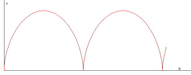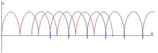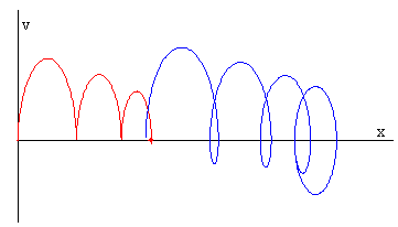 La figura muestra la trayectoria en el espacio de las fases x-v, de la caja (en color rojo) y del operario (en color azul) cuando el c.m. decelera F< μkMg, su velocidad se hace cero al cabo de cierto tiempo y el sistema de partículas no puede moverse más allá de cierta distancia.