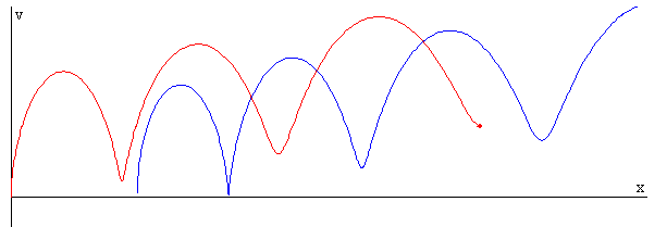 Datos: F=4.9 N, M=1 kg, m=1 kg, k=8 N/m, μs=0.75, μk=0.5 La figura muestra la trayectoria en el espacio de las fases x-v, de la caja (en color rojo) y del operario (en color azul) cuando el c.m. acelera F>μkMg.