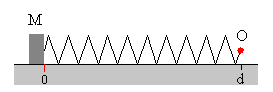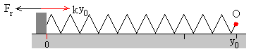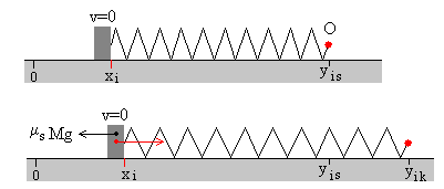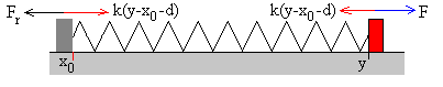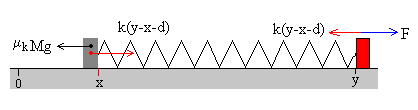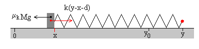 El operario se mueve con velocidad constante.La masa de la caja es M, el muelle elástico de constante k tiene una longitud natural d. El coeficiente de rozamiento estático es μs y el coeficiente de rozamiento cinético μk≤ μs. En la figura, se muestra la caja, el muelle elástico y el operario O en la situación inicial. La caja en el origen x=0, y el operario en la posición y=d. La caja en reposoCuando el operario se mueve hacia la derecha una distancia y del origen, el muelle se estira y la caja permanece en reposo en x=0. La fuerza de rozamiento Fr es igual a la fuerza que ejerce el muelle deformado k(y-d). En el momento en el que la fuerza de rozamiento alcanza su valor máximo μsMg, la caja empieza a deslizar. La posición del operario es y0 tal que k(y0-d)= μsMg En este instante ponemos en marcha el reloj, t=0 La caja deslizaEn un instante dado t, la caja se encuentra en la posición x y el operario se encuentra en la posición y Las fuerzas sobre la caja son: