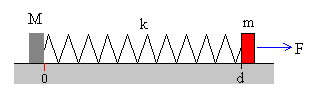 El operario ejerce una fuerza constanteTenemos en este caso, un sistema de dos partículas bajo la acción de dos fuerzas externas, la fuerza F que ejerce el operario y la fuerza de rozamiento Fr que ejerce el suelo sobre la caja y una fuerza de interacción mutua, que es la que ejerce el muelle elástico deformado que une ambos cuerpos. En la figura, se muestra la situación inicial Supongamos que un operario de masa m tira del extremo del muelle elástico de constante k con una fuerza constante F. El otro extremo del muelle elástico está unido a una caja de masa M. Estudiaremos la dinámica del sistema formado por ambos cuerpos. El planteamiento del problema tiene dos partes: