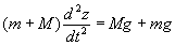 Ecuación del movimiento de cada una de las partículas: Cuando se libera el muelle, al cabo de un cierto tiempo t, la posición de la masa inferior m es x y el de la masa superior M es y. Aplicando las leyes de la dinámica a cada una de las partículas vamos a calcular sus posiciones x e y en función del tiempo t. La deformación del muelle en el instante t es l-(x-y) y la fuerza que ejerce el muelle sobre cada una de las partículas es F=k·(l-x+y).