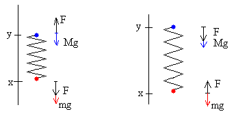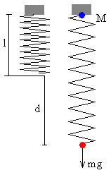 DescripciónConsideremos un sistema simple de partículas consistente en un muelle en posición vertical que tiene una masa M en el extremo superior y una masa m en su extremo inferior. Se supone que la masa del muelle es despreciable. Inicialmente, el muelle de constante k, está en equilibrio sujeto por la masa M tal como se muestra en la figura. Situación inicial: