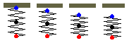 Teniendo en cuanta que sen2(ωt)+ cos2(ωt)=1, vemos que se cumple la ecuación que describe el balance energético para el sistema formado por dos partículas unidas por un muelle elástico. Levitación de la partícula inferiorPodemos observar que en los primeros instantes del movimiento, la partícula superior (de color azul) y el centro de masa (de color negro) se desplazan, pero la partícula inferior (de color rojo) apenas cambia su posición, parece estar suspendida durante unos instantes en el aire, tal como se puede observar en la figura y el el applet. En la ecuación que nos da la posición x de la partícula inferior, supongamos que w t es pequeño, cos(w t)≈1 x≈l+mg/k=l+d La posición de la partícula inferior cambia muy poco en los primeros instantes del movimiento. En la gráfica de la posición x en función del tiempo t, a la derecha en el applet, observamos un pequeño segmento horizontal de color rojo.
