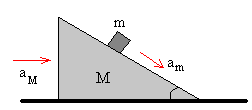 La aceleración de la cuña aM es de sentido contrario al señalado en las figuras. Despejamos del sistema de ecuaciones la aceleración am del bloque respecto de la cuña y la aceleración de la cuña aM respecto de Tierra.