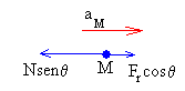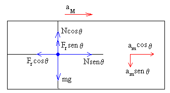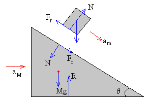 A lo largo del eje horizontal, la ecuación del movimiento es Fr·cosθ-N·senθ=M·aM (3) A lo largo de la dirección vertical, la cuña está en equilibrio. Sumando la primera y tercera ecuación, obtenemos la relación entre las aceleraciones am y aM. m(am·cosθ+aM)+ M·aM=0